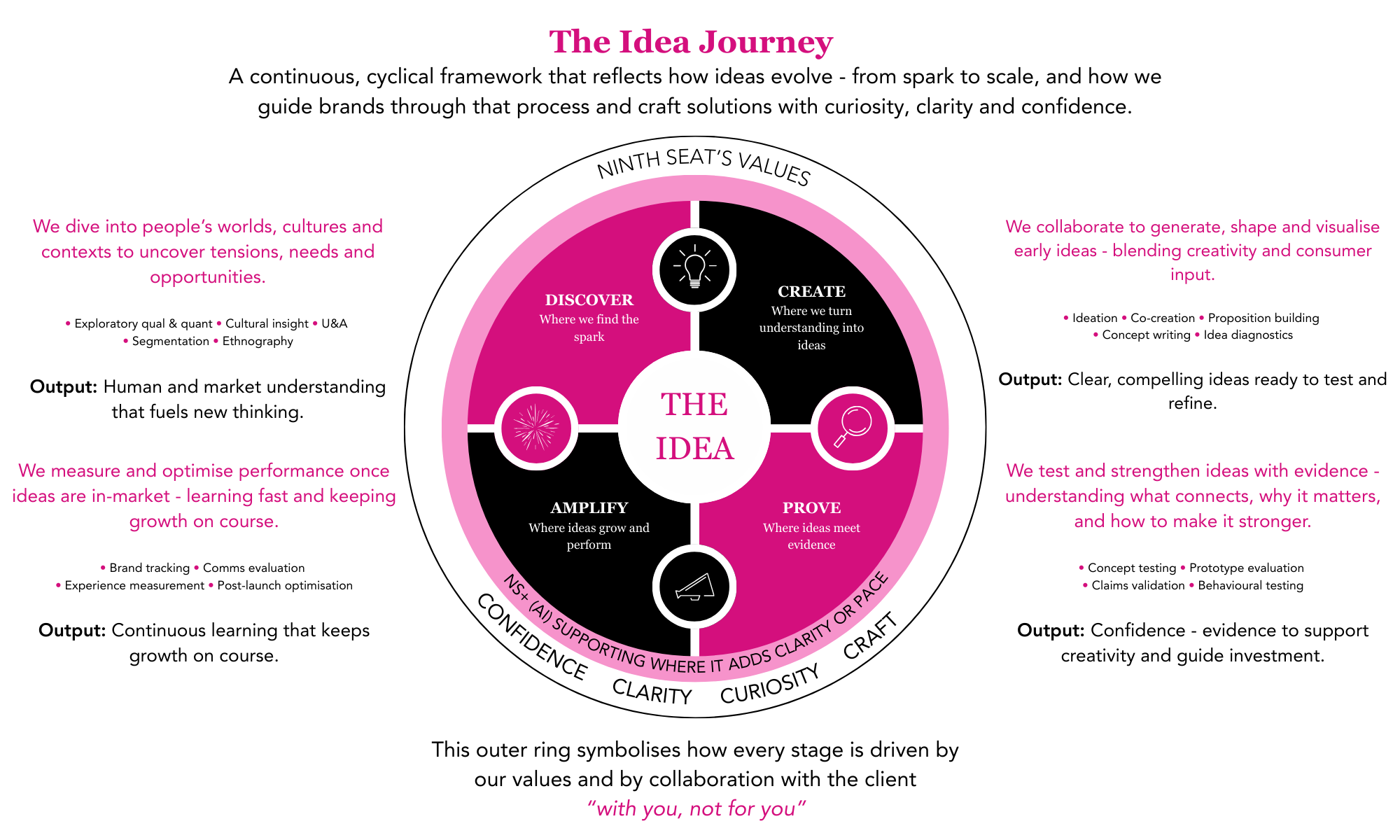 We guide brands to explore, create, prove and refine ideas that drive progress / fuel growth. Our curiosity unlocks opportunity, our evidence builds confidence, and our craft ensures clarity every step of the way.
